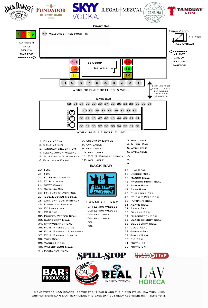 • The bar will be cleaned and reset after each contestant. The bartender will have four (4) minutes to arrange their tins, specialty bottles, specialty store-n-pours, and props in their station. You may use the back bar for more room.